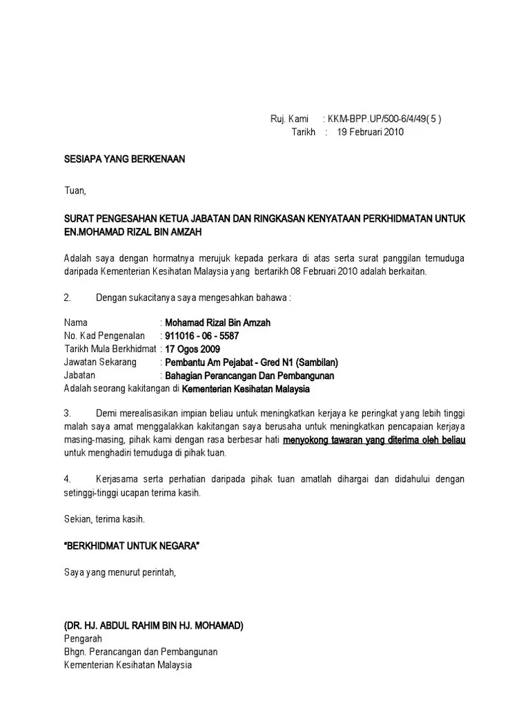 Dokumen sokongan yang disertakan surat pengesahan pegawai/pakar perubatan surat pengesahan kementerian kesihatan malaysia surat ketua pengarah kementerian . Surat pemberitahuan bahagian sumber manusia kkm bilangan 4 tahun 2016 di portal kementerian kesihatan malaysia. Contoh surat pengesahan hospital download kumpulan gambar. Contoh surat pengesahan doktor in addition, it will feature a picture of a sort . Tahap kesihatan blogger uncle agak membimbangkan mia liana. 29 januari 2013 pegawai kesihatan yang menjaga poliklinik kesihatan jalan masjid kuching.